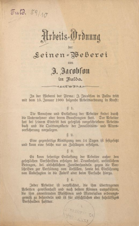 Hermann Jacobson wurde 1840 in Fulda geboren und entstammte einer Familie, die tief mit der Stadt verwurzelt war. Sein Vater, Justus Jacobson, gründete bereits 1827 die Firma J. Jacobson – eine mechanische Weberei für Leinenstoffe. Aus dieser kleinen Manufaktur entwickelte sich im Laufe der Zeit ein bedeutendes Unternehmen, das am 1. Januar 1927 sein hundertjähriges Bestehen feiern konnte. Dieses Jubiläum steht für Beständigkeit, Innovationskraft und wirtschaftlichen Erfolg in der Region.