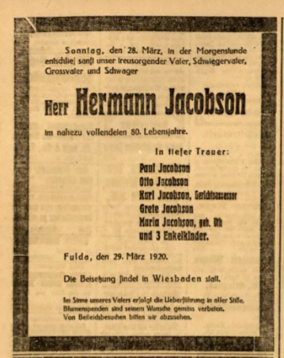Am 28. März 1920 starb Hermann Jacobson an einem Schlaganfall. Die Beisetzung fand in Wiesbaden statt.